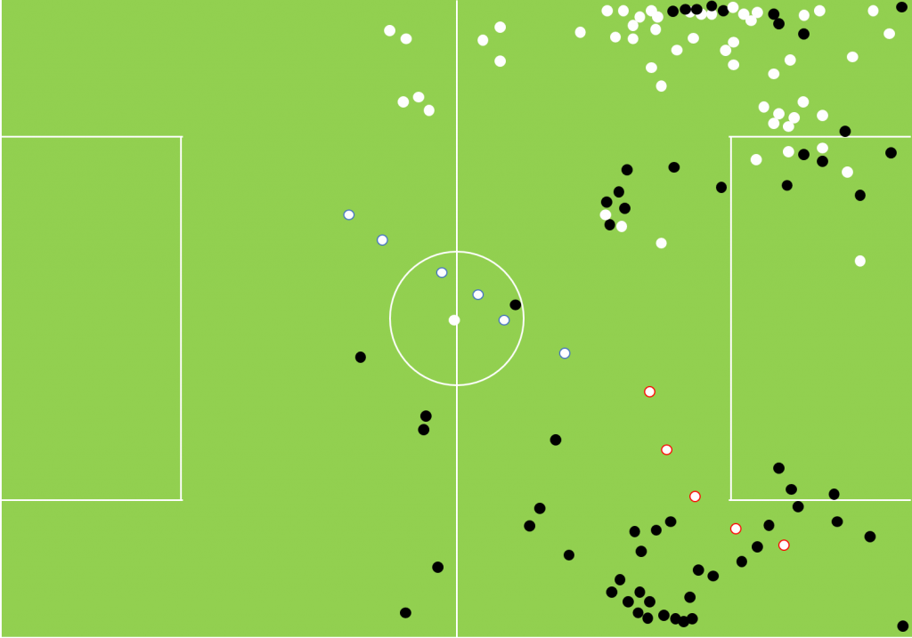 Grant’s white dots are more frequently central and concentrated more in the box. Whilst this is just one example, this has been a long-term trend that can be seen ever since he started moving more centrally following the Fleetwood game. Only a fraction of them were on the touchline. In these games, he has shredded his ‘touchline hugger’ reputation.