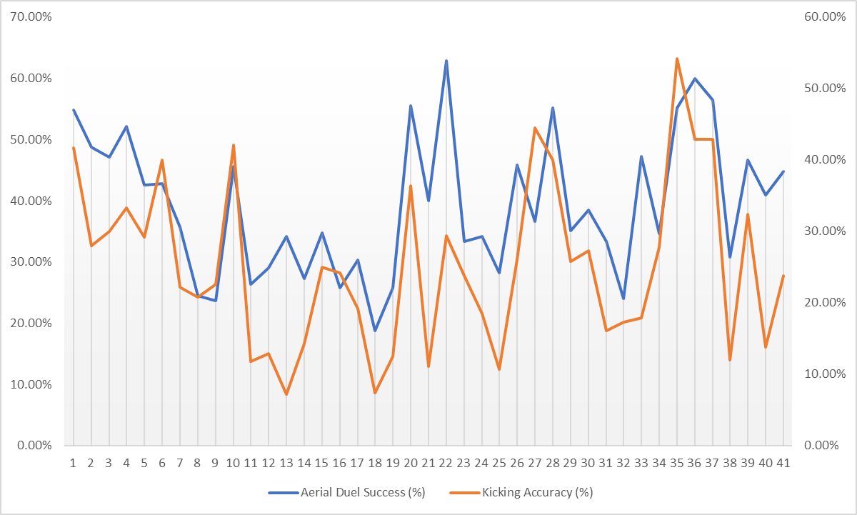 This is summed up in the graph below: as the aerial duel success of the strikers on the pitch increases, so to does the kicking accuracy of the goalkeeper. Of course, not every kick is to a striker, nor every header won by a striker from a goal-kick, but the relationship is very much related.