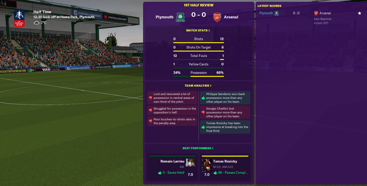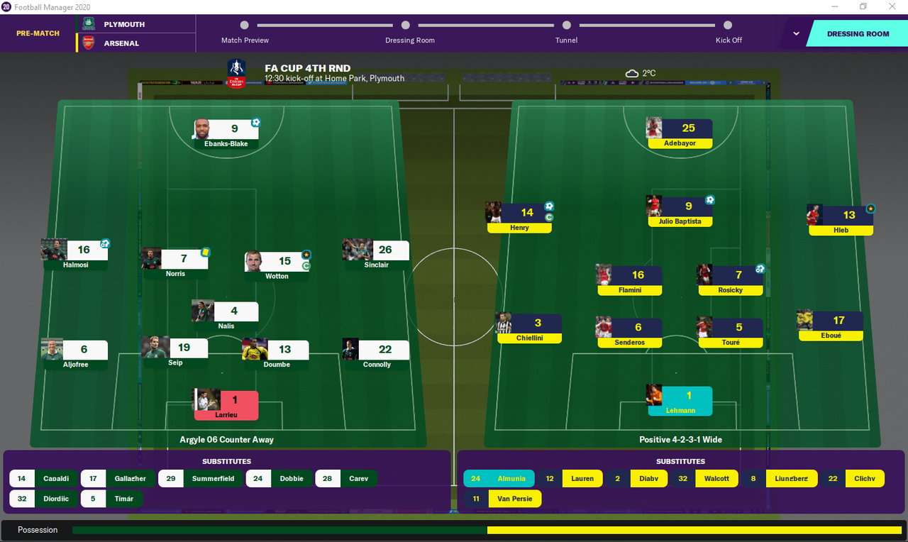 Here they are then. Not many remain from the Invincibles era. Thierry Henry captains The Arsenal in his final season before moving to Barcelona (well, in our reality). They must have signed 22 year old Georgio Chiellini recently. It’s Paul Connolly versus Thierry Henry. Adebayor versus Marcel Seip. It’s Plymouth Argyle versus Arsenal.