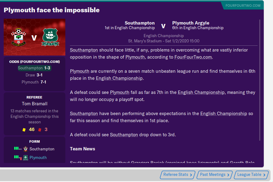 It’s not like the league games are any easier. Southampton currently top of the pile are our next opponents.