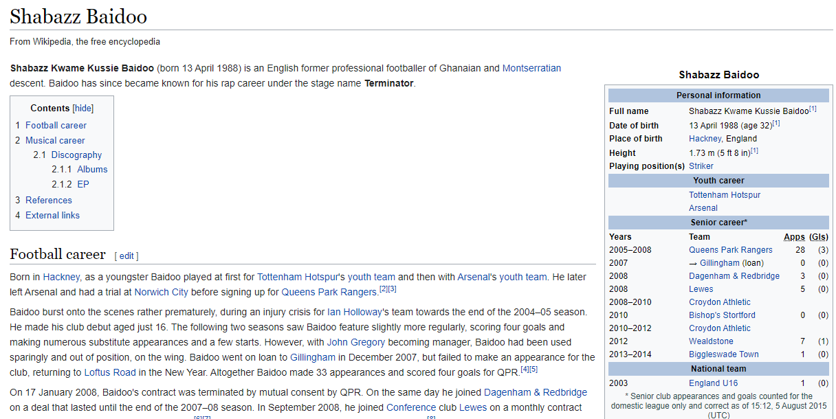 According to Wikipedia, our opposition striker is now a rapper who goes by the name ‘Terminator’.
