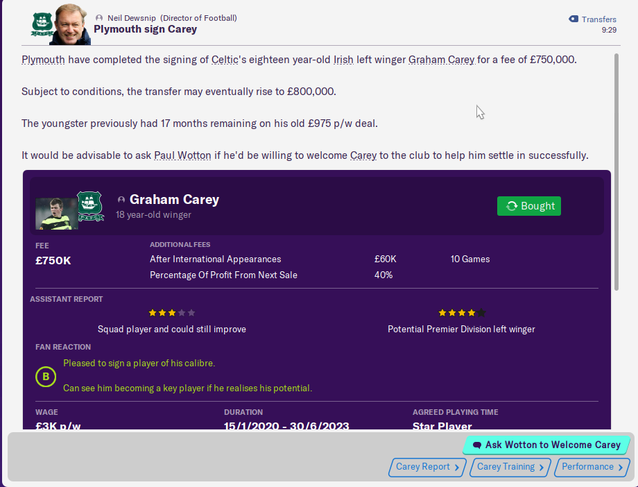 Here he is then, I have quite literally broke the bank to bring this confused teenager to Home Park. It was something like £400k upfront with the rest in instalments and clauses/bonuses.
