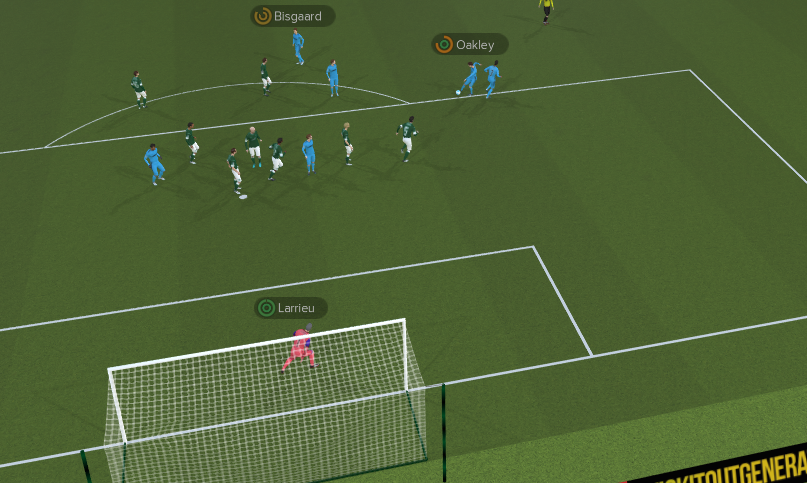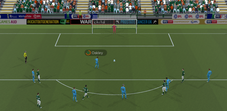 10 minutes into the second half and Oakley rips a low shot on the edge of the box..