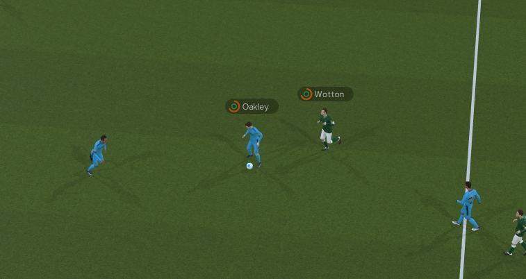 Oakley with the ball, shaken after his penalty miss. The last person you want breathing down your neck is Paul Wotton, he robs Oakley easily.