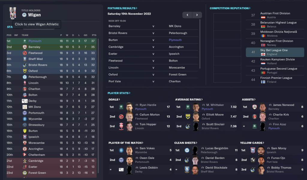 For the two ‘number 10’s’ we have gone with an Advanced Player on Support and an Attacking Midfielder on Attack. These two roles will offer the balance needed in attack. Football Manager is all about balancing attacking and supporting roles. With Bali Mumba set to attack on the left the playmaker will compliment him well on a support role. He will always be looking for that killer ball to play in the striker and attacking midfielder. As Argyle’s highest rated players in the game, it makes sense to play Azaz and Whittaker together. Danny Mayor is a great back up. By November, Whittaker has 10 goals 2 assists and Azaz 3 goals 6 assists. The attacking midfielder will break into the box and score, and the playmaker assist. Perfect.